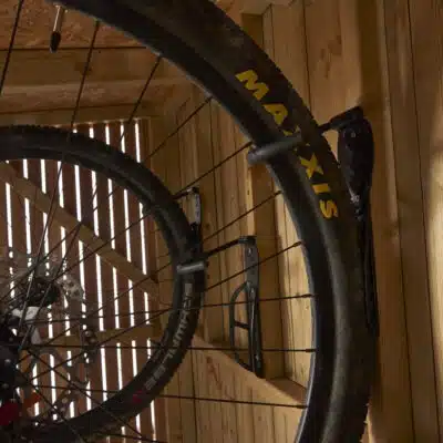 In our vertical bike sheds we use simple hooks which allow you to hang bikes by their front wheels. An alternative to these hooks is Steadyrack. It is a stronger and more expensive option. This solution lets you swivel the bikes and store them at an angle from the wall.
